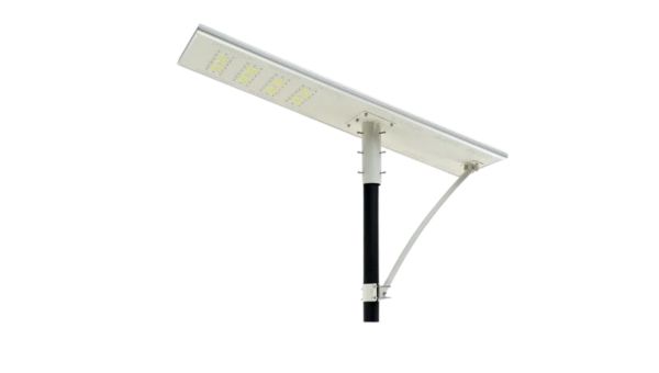 An all-in-one solar street light integrates the solar panel, battery, LED light, and control system into one compact, self-contained unit, offering an off-grid solution with minimal installation requirements.