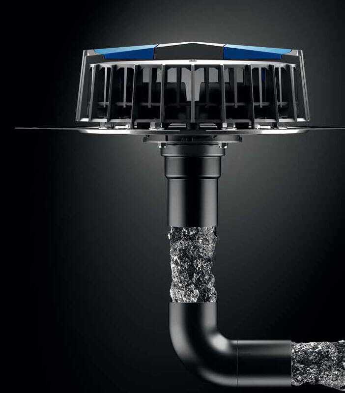 While conventional systems simply allow rain to run off through sloping pipes, the compact Geberit Pluvia syphonic roof drainage system pipe fills up quickly and extracts the rainwater from the roof using the resultant negative pressure. The Geberit Pluvia roof outlets prevent air from being sucked in and guarantee reliable performance.